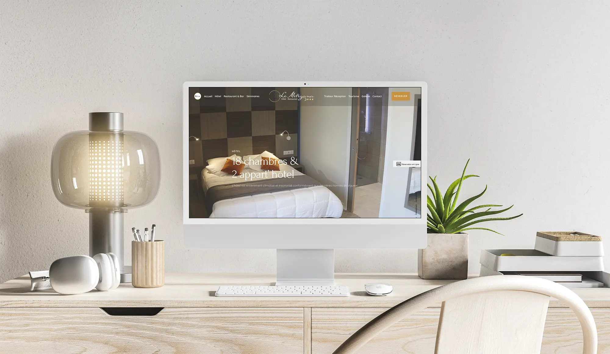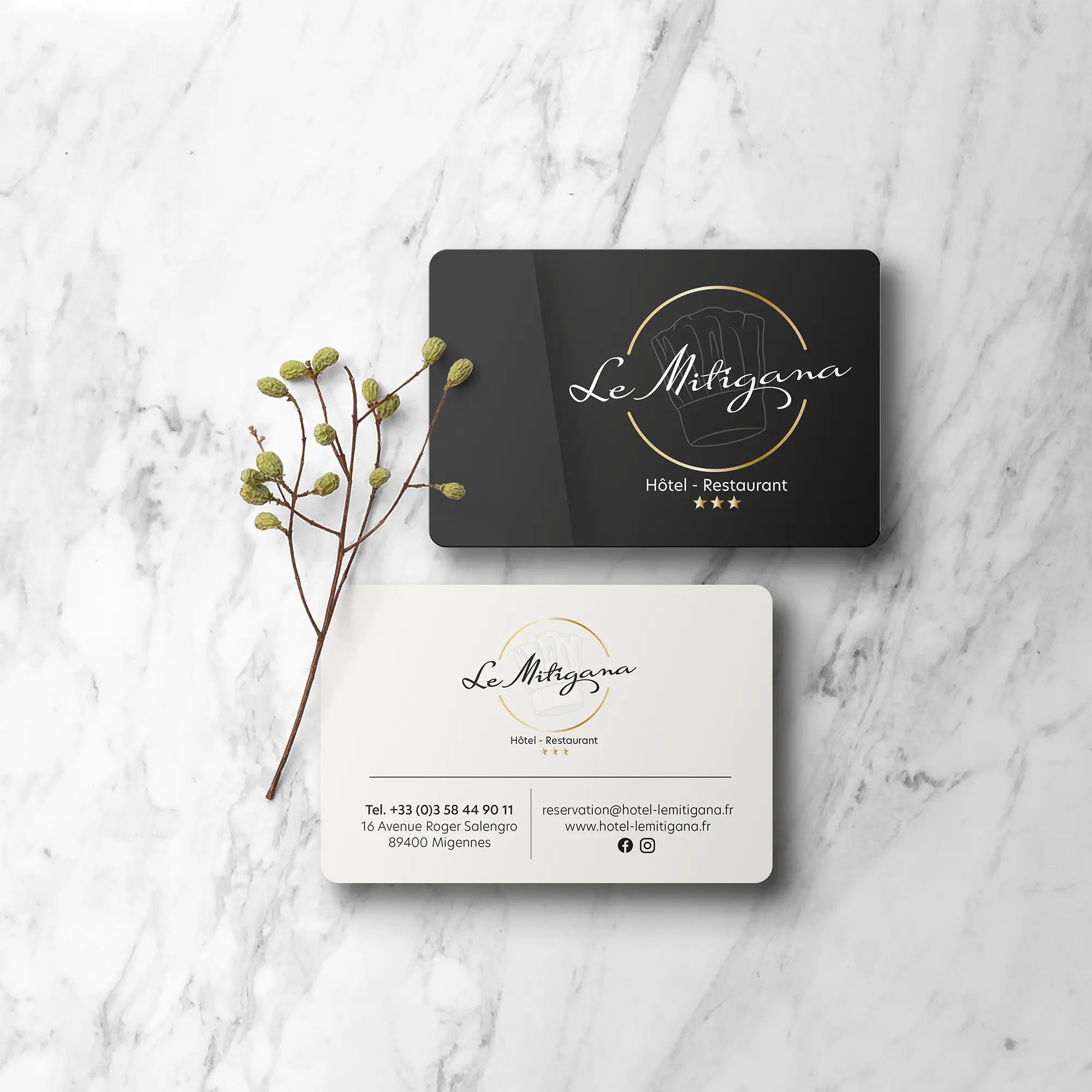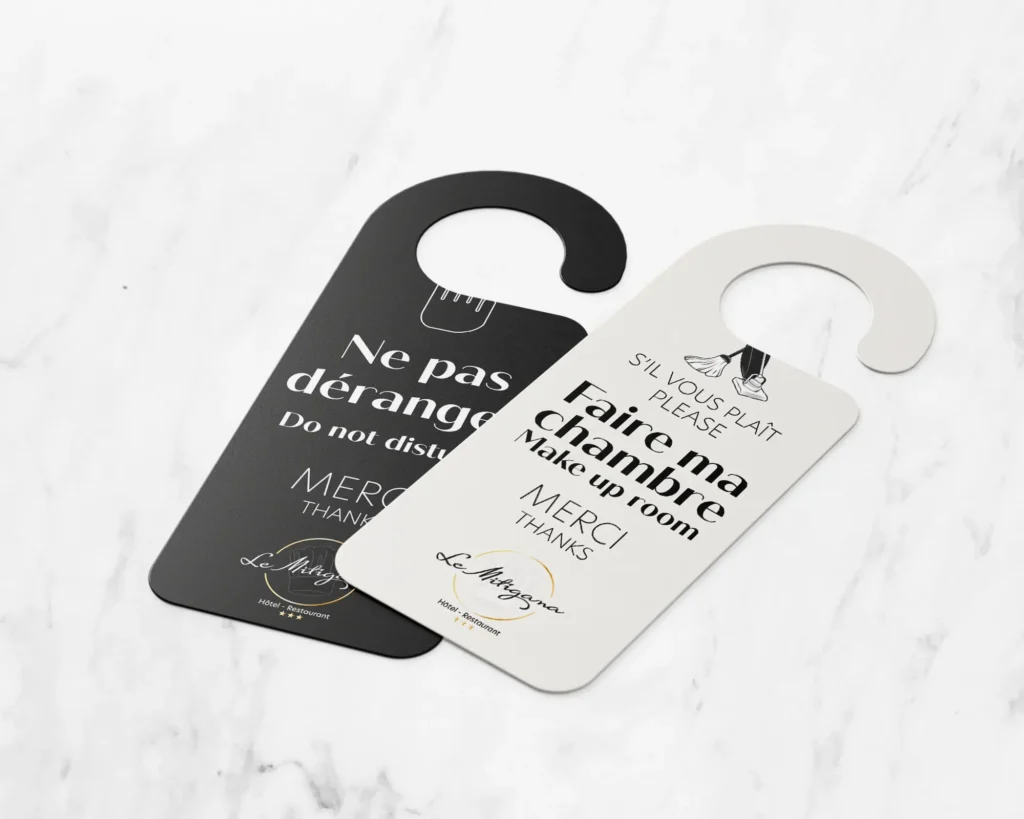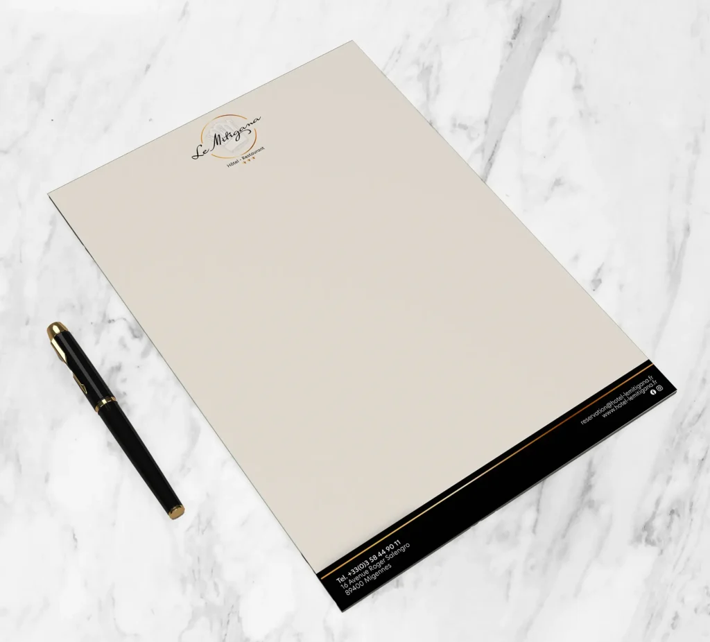 Une identité graphique et l’ensemble des supports de communications : cartes de visite, blocs-notes, stylos, communication en chambre et au restaurant.
